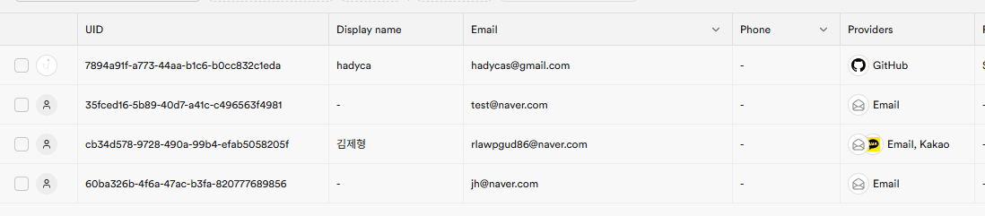 이렇게 하면, 아래와 같이 db에 기존 이메일 주소가 있는 경우(카카오)에는 로그인에 문제가 안되는데, 기존 이메일이 없는 경우(깃헙)에는 에러가 뜬다 . 이 문제를 해결해보자.