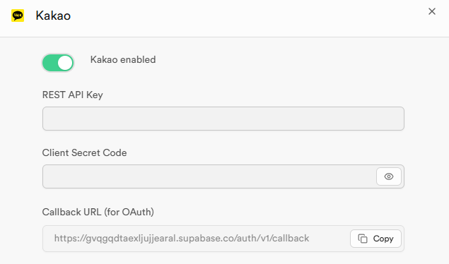 4) 카카오 로그인 탭 - Redirect URI에 supabase Callback URL 값 넣기 + 활성화