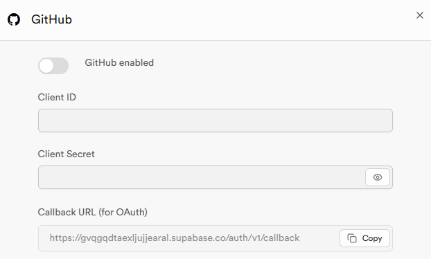 Supabase > Authentication > Sign in / Up 에서 github를 클릭 하면 아래 화면이 나온다.