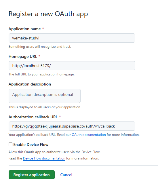 등록 한 후 클라이언트 ID와 클라이언트 secrets를 supabase 화면에 입력한다.