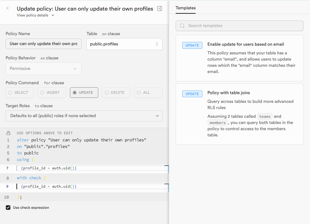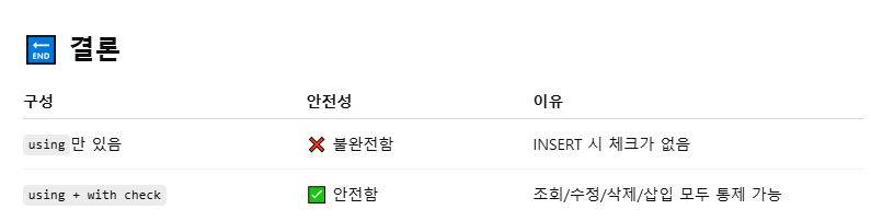 이 때, update 시에는 보통 using과 with check을 동시에 사용 한다.