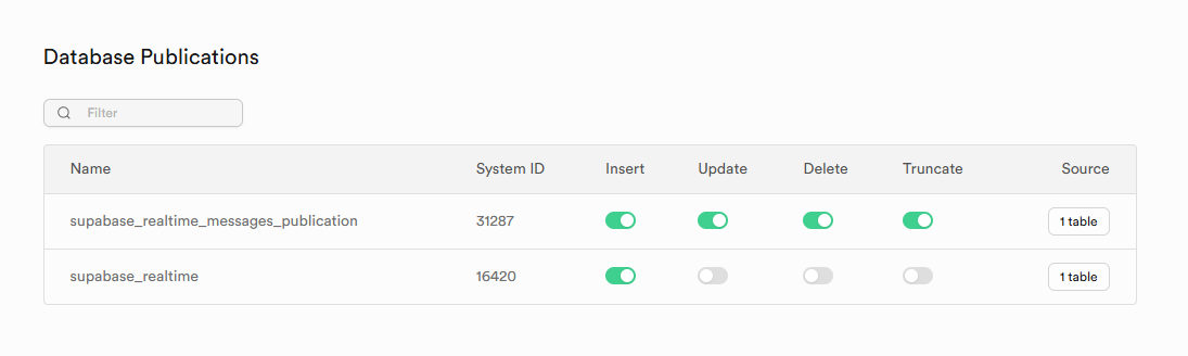 먼저 supabase에서 세팅을 해야한다. supabase -> database -> publications 에 가면 아래 supabase_realtime 1개만 보일 것이다. (위에꺼는 안보임). 거기에서 table을 누르고 내가 원하는 (messages) 테이블을 on 스위치 해주면 된다.