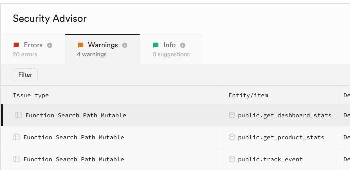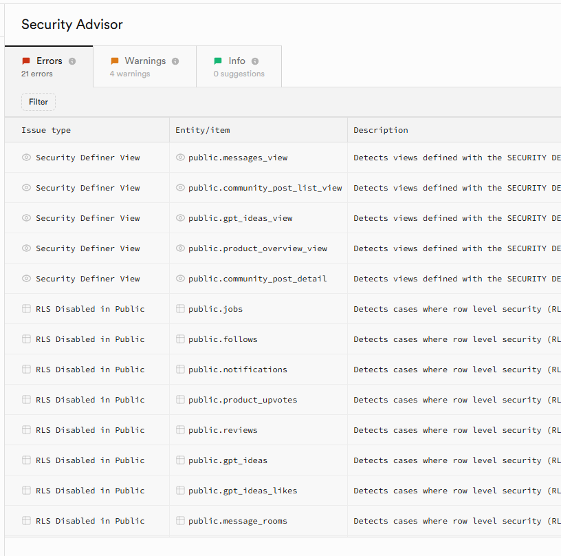 security advisor 화면을 보면 errors 탭에 Security Definer View와 RLS~~가 있다. RLS부분은 위에서 다룬 내용이고, Security Definer만 해결하면 된다.