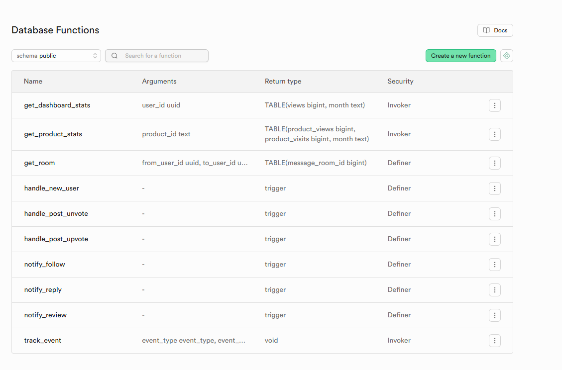 **추가로 아래와 같이 함수들에 대해 Security 부분에 Invoker와 Definer가 있는데, 코드에서 내가 해당 함수를 호출할거면 Invoker로 해야 한다(별도 명시를 안하면 Definer로 설정됨). 아래 같은 경우에는 get_room이 Definer로 되어있는 문제가 있다. 실수로 SECURITY DEFINER라고 명시했기 때문이다. 해당 함수를 삭제하고 다시 선언해주면 된다.(이건 연습이니, 따로 안함)