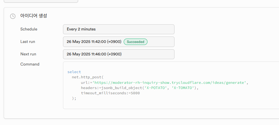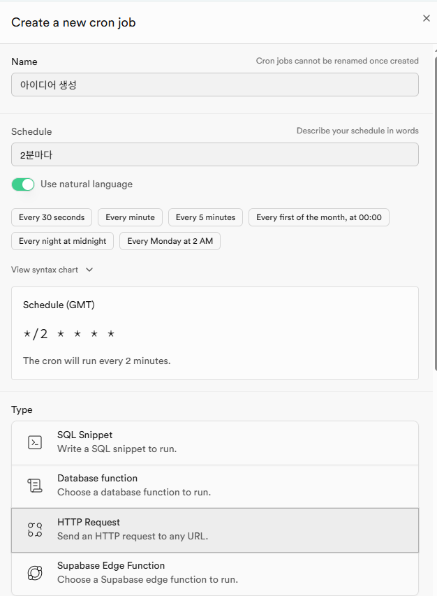 supabase -> intergrations-> cron부분에서 생성하기를 누른 다음