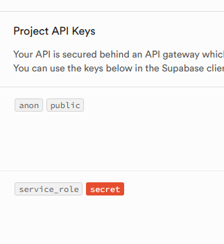 먼저, 외부 api를 사용하기 위해서는(특히 유료) supabase의 api key를 별도 세팅해야 한다. 기본적으로는 위 public key를 사용해도 문제가 없다. (RLS를 하기 떄문에). 하지만 chatgpt 같은 외부 api를 호출하는 경우에는 아래 service role key를 사용 해야 한다.