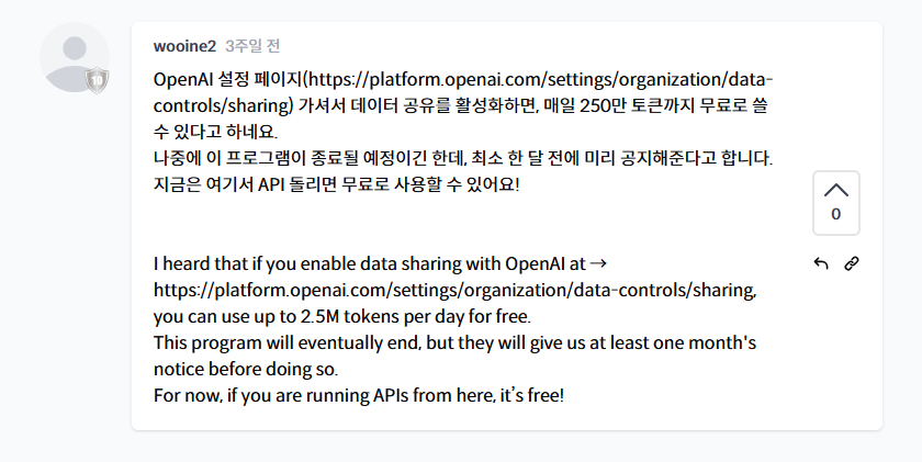 해당 키를 .env 파일 OPENAI_API_KEY값에 넣어두자